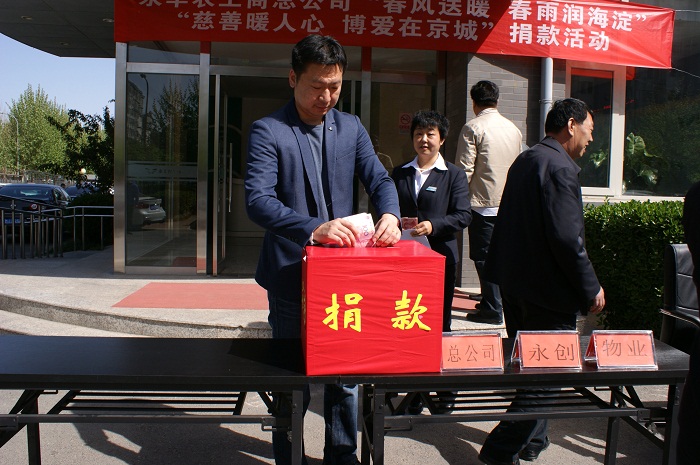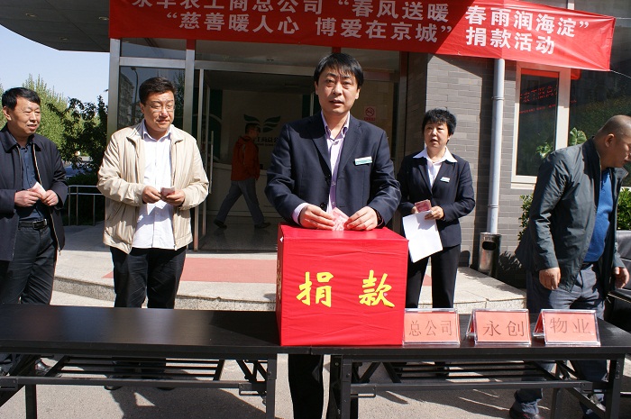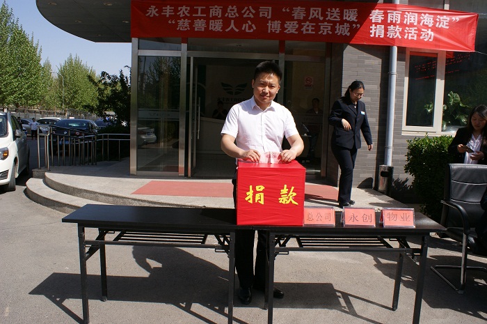 2016年4月22日,在永豐農(nóng)工商總公司辦公樓門前,舉辦了永豐農(nóng)工商總公司“春風送暖 春雨潤海淀”“慈善暖人心 博愛在京城”捐款活動。